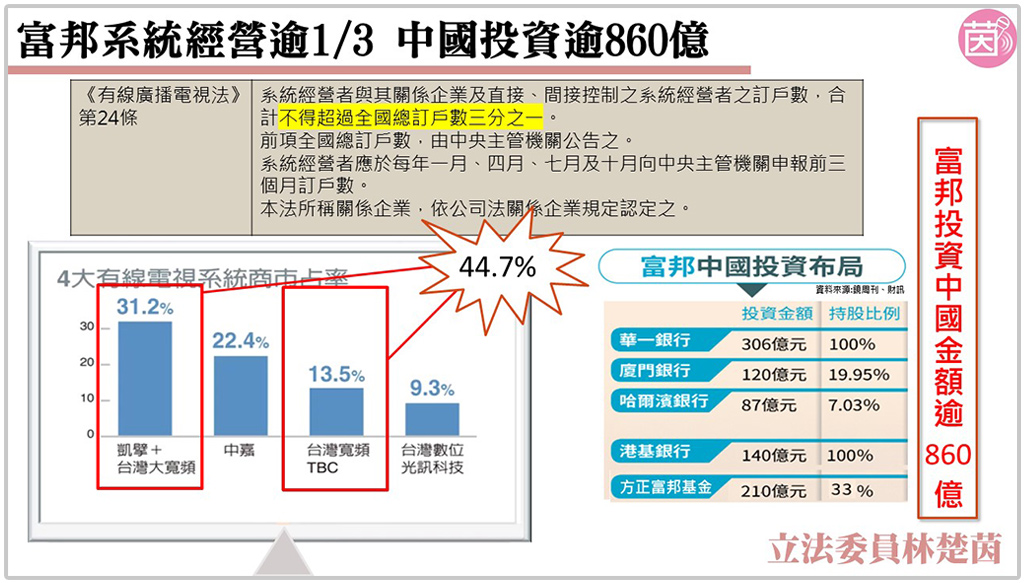 泛富邦系統業者市占率已高達31.2%,若富邦透過借貸關係,控制TBC,將一舉突破33.3%的規範達到44.7%。林楚茵認為,富邦在中國投資的金額高達860億,中國養套殺的招式屢見不鮮,頻道和系統的發展與民主政治息息相關,她呼籲,不能讓台灣媒體因此赤化。