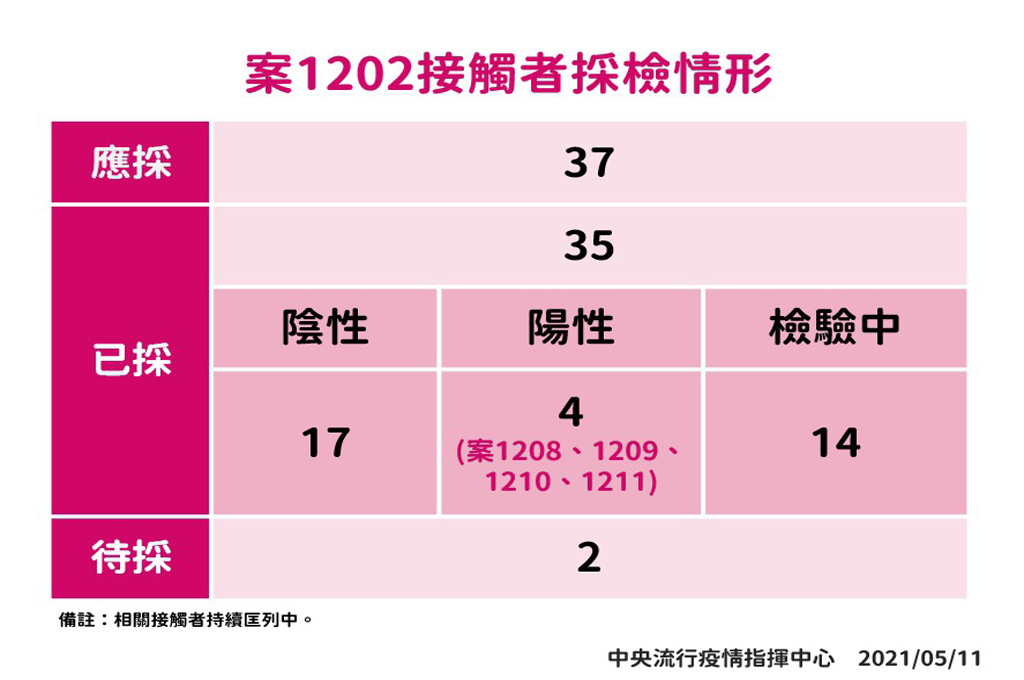 指揮中心表示,案1208、案1209及案1211為案1202同事(案1208 Ct值11;案1209 Ct值20;案1211 Ct值25),皆為女性,年齡介於10多歲至40多歲,其中2人無症狀,案1211於5月8日曾有不適情形;案1210為遊藝場常客(Ct值12),30多歲男性,5月9日曾有咳嗽、腹瀉症狀。
