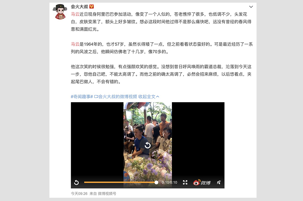 微博網友「會火大叔」在社群平台上分享馬雲出席阿里日的影片,直呼「好像變了個人似的」,不僅樣態蒼老、憔悴了很多,行事作風也低調不少,頭髮花白、額頭上多了皺紋,「想必這段時間他過得不是那麼痛快吧,遠沒有曾經的春風得意和滿面紅光」。