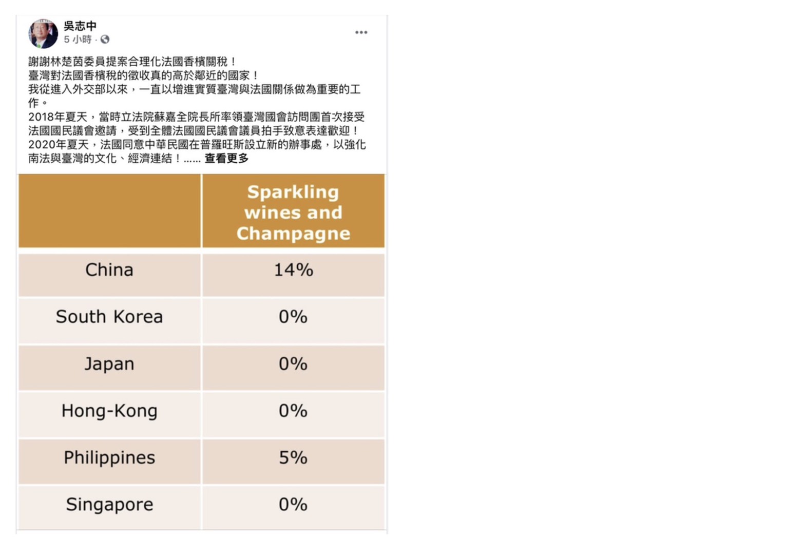 立法委員林楚茵今(30)日表示,身為立法院「臺法國會友好協會」副會長,長期關注與推動臺法之間的交流活動,亦致力於推進臺法情誼。林楚茵表示,身為財政委員會委員,過去在稅制上便發現在菸酒稅法中屬同類的香檳和葡萄酒,在海關進口稅則中卻被課以不同關稅,早有修法念頭。適逢台灣時間5月7日時,法國參議院以304:0無異議贊成通過「支持台灣參與國際組織活動」的決議,林楚茵認為可藉此修正案應表達對法感謝,而將連署提案送出。然本案在月初送交議事處後,本土疫情爆發、15日雙北進入三級警戒,緊接著立法院決議委員會停會一週,導致本案於下週一(31日)才排入院會一讀,純屬時間上巧合,並非刻意於疫情期間做此提案。