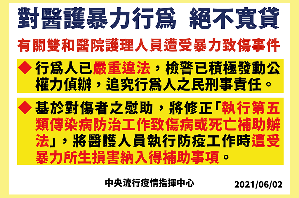 此外,行政院院長蘇貞昌於今早開會時,特別指示,倘若相關的醫護人員和警消因執行勤務而染疫或遭受攻擊,除了會給予慰問金和本來的醫療保險等等的給付之外,還會給他們妥善的照顧,若造成身體有重大難治或不治的傷害,會全力地協助醫療照顧,並讓他們得到相對的補償。