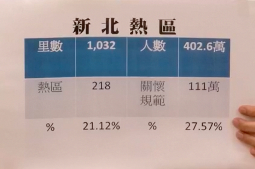 羅致政說明,根據新北市長侯友宜昨(2)日公佈的新北市的熱區總量、關懷的里數以及熱區民眾受到關懷規範的數據表,在新北1032里中有218里被劃為熱區,佔了新北總里數超兩成,換句話說有五分之一的里都淪陷了。