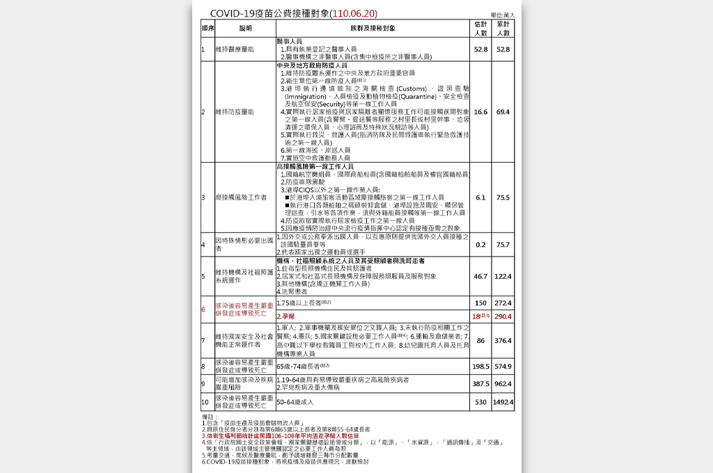 衛福部傳染病防治諮詢會預防接種組(ACIP)昨日召開專家會議,討論疫苗接種順序,根據最新公布的接種順序表,在第6類新增孕婦,共計約18萬人,與75歲長者位在相同順位。而在前10順位中,累計1492.4萬人,若全數接種約涵蓋我國6成人口,能有一定群體保護力。