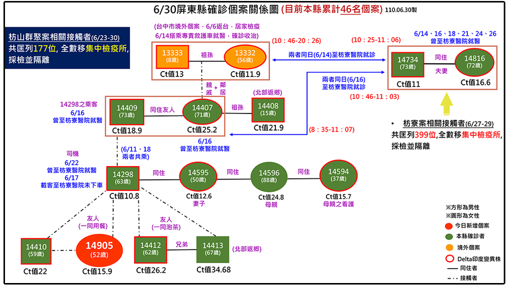 目前枋山群聚感染案13人及枋寮果農夫婦共15人中,中央流行疫情指揮中心證實有12人感染印度Delta病毒株,包含秘魯嬤孫「13332」、「13333」及司機「14298」、司機妻子「14595」、外籍看護「14594」、泡茶友人「14412」、共餐友人「14410」、乘客「14409」和其同居友人「14407」、同居友孫子「14408」及枋寮果農夫婦「14734」、「14816」,其餘人基因定序比對結果雖尚未出爐,但中央流行疫情指揮中心研判感染同一種病毒株機率高。