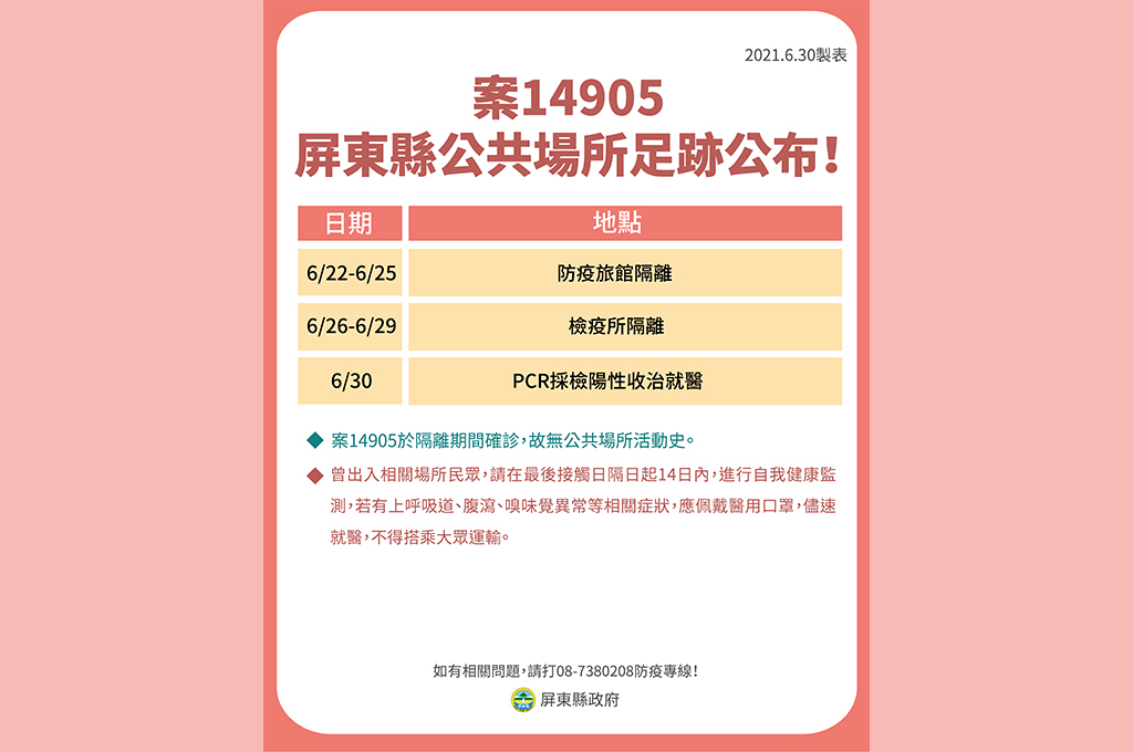 施承貴指出,今日屏東確診個案為案14905,她為52歲女果農,21日曾與確診司機「14298」、友人「14410」一起吃麵。22日深夜透過疫調匡列後,最初一採為陰性,並於防疫旅館居家隔離;26日轉至集中檢疫所;28日出現發燒症狀,二採陰轉陽30日確診。