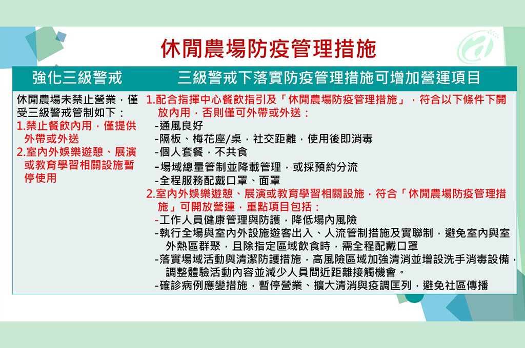 農委會輔導處休閒產業科長楊欣佳表示,原本休閒農產沒有並禁止營業,但餐飲部門禁止內用,變成只能住宿,然後在房間吃東西。因為餐飲部門也不能外食,三級警戒下,娛樂、展演、遊憩場域,或是體驗學習、做DIY的場域,即使在休閒農場裡面也不能從事做活動。目前休閒農場就算維持營業,但這樣的經營,不符合國人平時到休閒農場遊玩的樣態。
