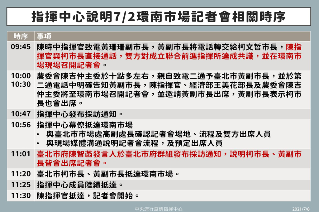 陳時中表示,當日均依照指揮中心記者會程序,發布採訪通知;指揮中心幕僚抵達環南市場後,也與台北市市場處高副處長確認記者會場地、流程及雙方出席人員,同時與現場媒體溝通說明記者會流程及預定出席人員。當日上午11點01分,台北市府陳智菡發言人於北市府群組發布採訪通知,說明柯市長、黃副市長皆會出席記者會;上午11點20分柯市長、黃副市長抵達環南市場。