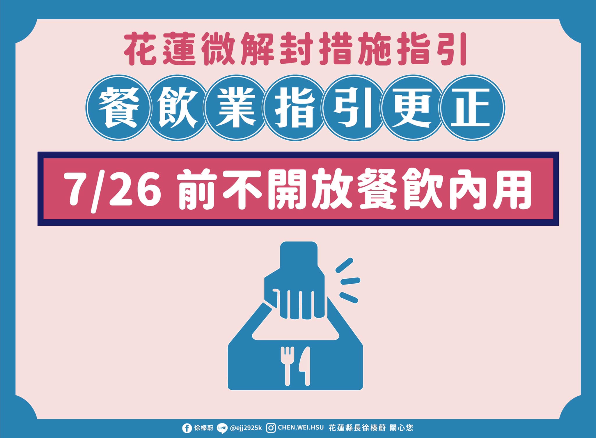 花蓮縣長徐榛蔚及花蓮縣政府皆於臉書發布快訊,指出日前中央雖公告餐飲業微解封,但近期疫情仍屬嚴峻,多家餐飲業者反映內用可能導致防疫破口,花蓮縣政府團隊幾經考量,基於防疫優先之整體一致性,7月26日前餐飲業販售仍維持外帶,全面禁止內用。