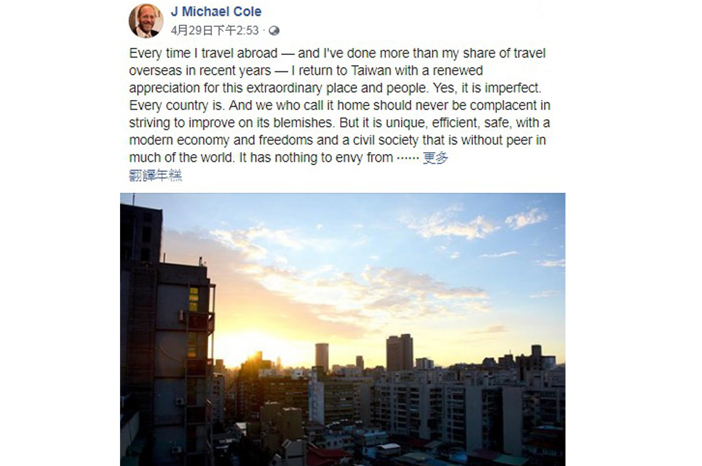 日前資深駐台加拿大記者寇謐將(J Michael Cole)於臉書發文,每次從國外旅行回到台灣時,仍會重新喜歡上這塊土地和人民,對於一些喜歡抱怨台灣的人,他表示沒有一個國家是完美的,在努力改善污點時,雖不應自滿,但台灣獨特、便利、安全、具有現代經濟和自由的社會結構,卻是無需羨慕他人的,台灣人應該為「家」而感到驕傲,且誓死保護。