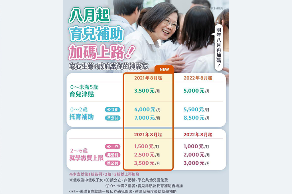 另外,從這個月一號開始,「零到六歲,國家跟你一起養」的育兒補助加碼已經上路。蔡英文指出,育兒津貼和托育補助,提高了1千元;2到6歲小朋友就學繳費上限,也再減少1千元,明年還會再加碼。