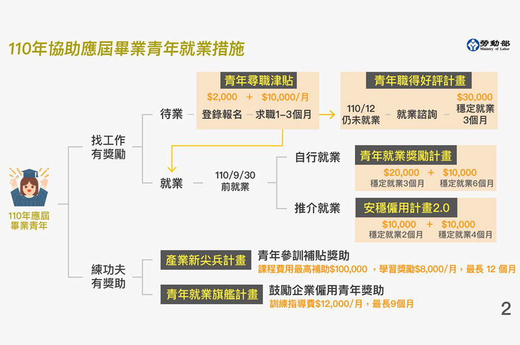政府同時也鼓勵雇主僱用青年,只要是經由公立就業服務機構媒合成功的,青年勞工可獲得最高2萬元的就業獎勵金、雇主也可得到最高3萬元的僱用獎勵金。對於想要自行創業的年輕人,政府也會持續提供資金協助,青年創業貸款額度已由350億元提高至600億元,5年優惠利息補貼的申貸期限,也延長至今年12月底。