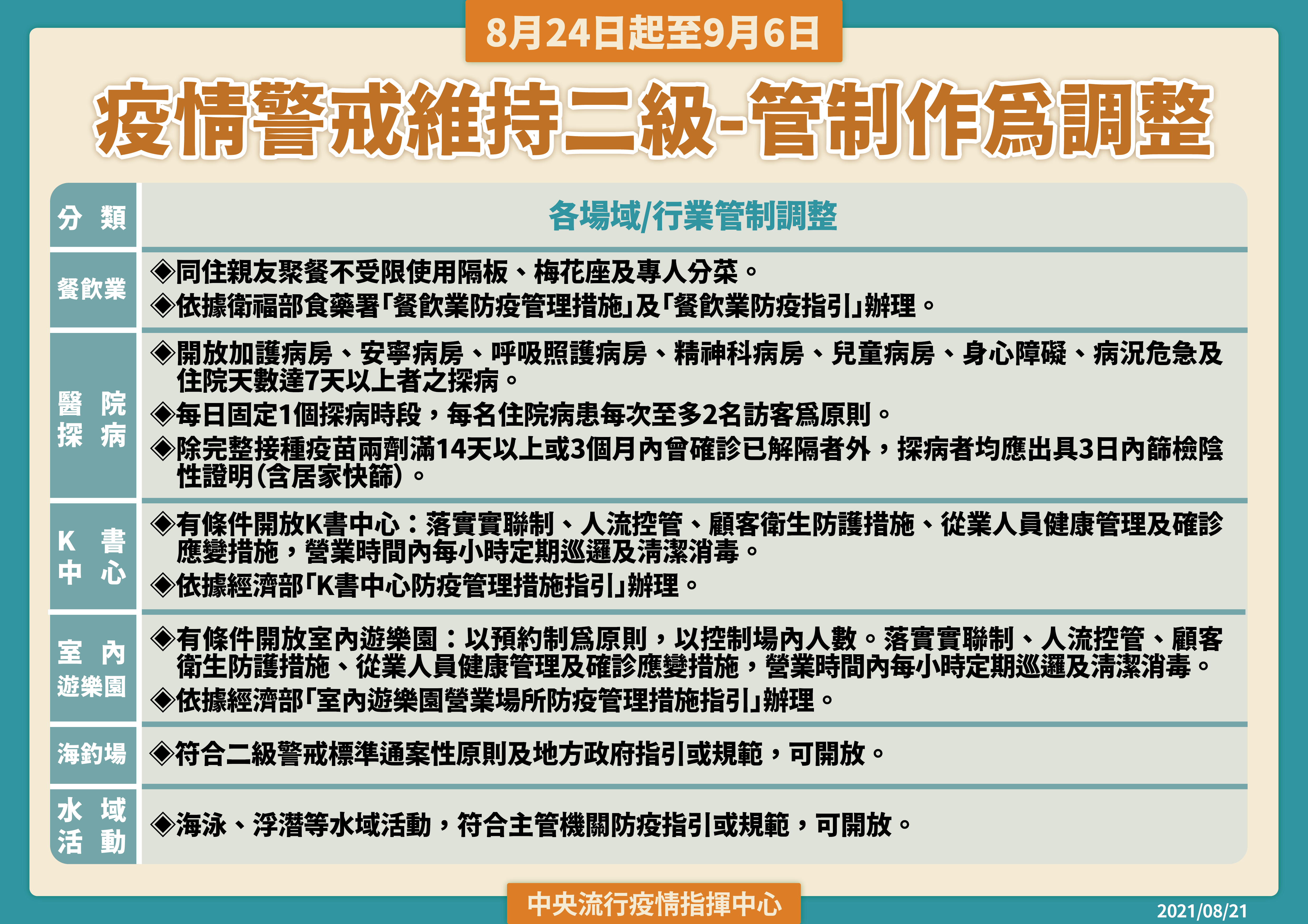 中央流行疫情指揮中心今(21)日表示,考量國內疫情雖趨緩但仍有零星不明感染源之本土病例,經與相關單位溝通討論及評估後,宣布自今(2021)年8月24日至9月6日維持疫情警戒標準為第二級,並將維持或調整相關管制規定如下: