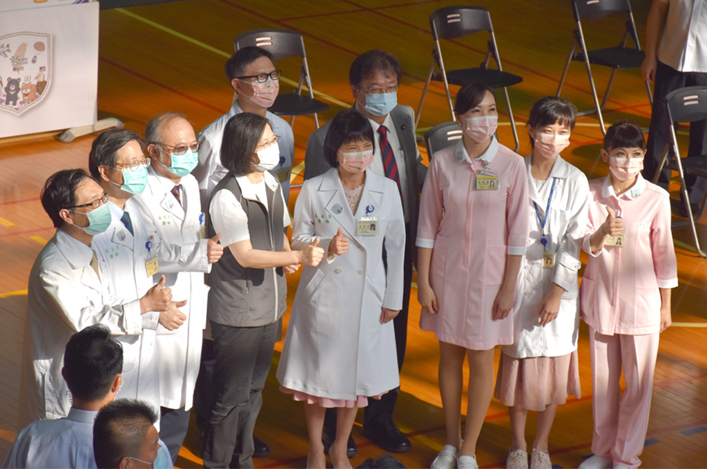 從到場到接種完畢前後約10分鐘,蔡英文也向媒體秀出接種小黃卡,並與醫療人員合照一同比讚。