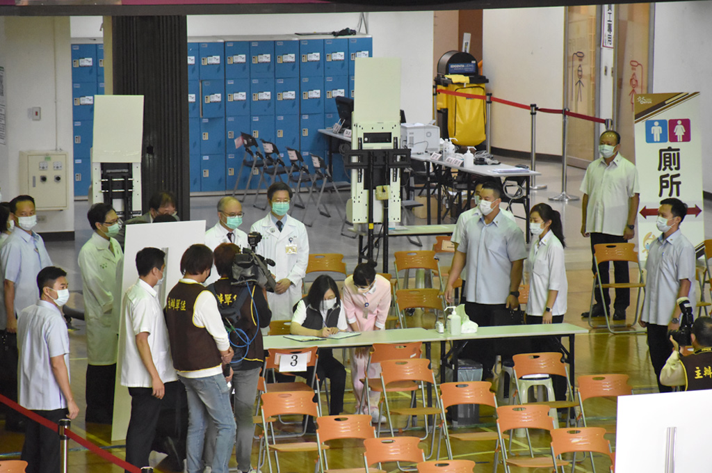 蔡英文約7時27 分 抵達現場,精神看起來十分不錯,體溫36.9度,在報到完後,接受醫生說明接種高端疫苗的注意事項。