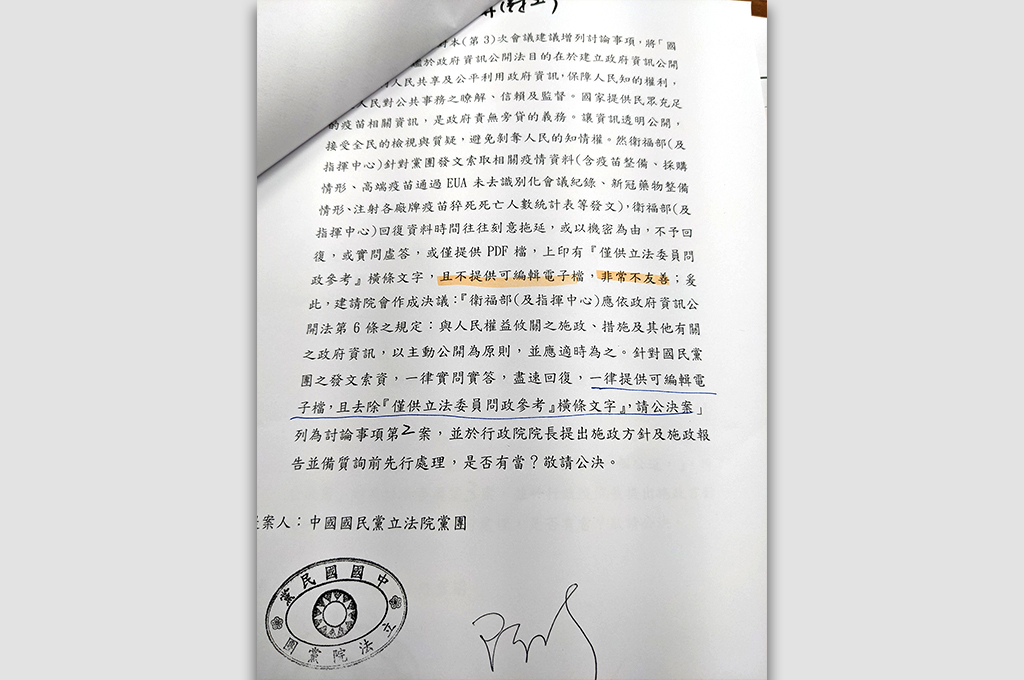 國民黨團荒謬提案不只這一件,有一案提到,衛福部提供的疫情資料不是刻意拖延,就是以機密為由不予回覆,或僅提供PDF檔,不提供可編輯電子檔,非常不友善。鄭運鵬質疑,「行政部門不能提供PDF檔,是要讓國民黨可以竄改公文書?」