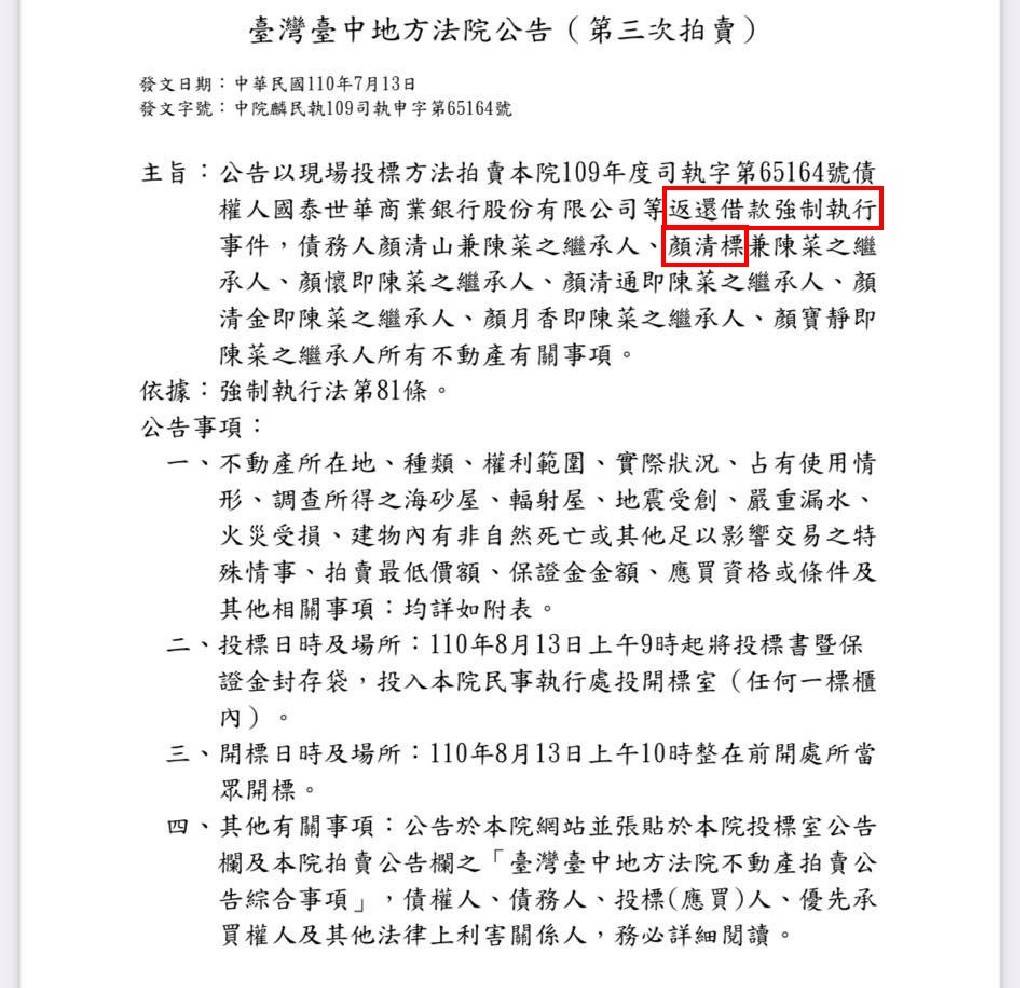 對此,周玉蔻今日在臉書上再貼出新的證據,為台中市地方法院公告的法拍文件,公告中標明為「返還借款強制執行事件」,債權人為國泰世華商業銀行,債務人則列舉了,顏清標在內的顏家一干人等。