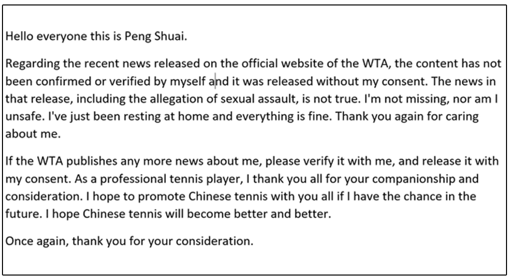 中共官媒《環球電視網》昨日在推特發文,自行揭露彭帥寄給國際女子網球協會(WTA)的mail內容,內文宣稱「我沒有失蹤或是不安全。我只是在家休息,一切都很好。」