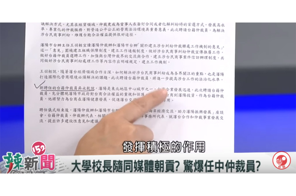 陳亭妃接著拿出,中國遼寧省去年的報紙,「2018年5月21號,遼寧省瀋陽市日前舉行儀式聘任四名台灣籍人士為仲裁員,新聘任的台籍仲裁員吳永乾說 他將努力為台商在瀋陽健康發展促進瀋台交流合作,發揮積極的作用,這個是不是你世新的校長?」