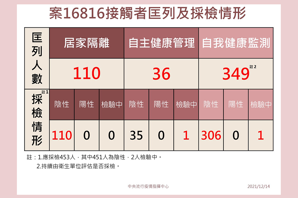 陳時中表示,案16816目前已匡列的接觸者,共有110人列為居家隔離,採檢結果全為陰性,自主健康管理有36人,其中35人陰性,1檢驗中,而349人為自我健康監測者,其中306人陰性,1人檢驗中。