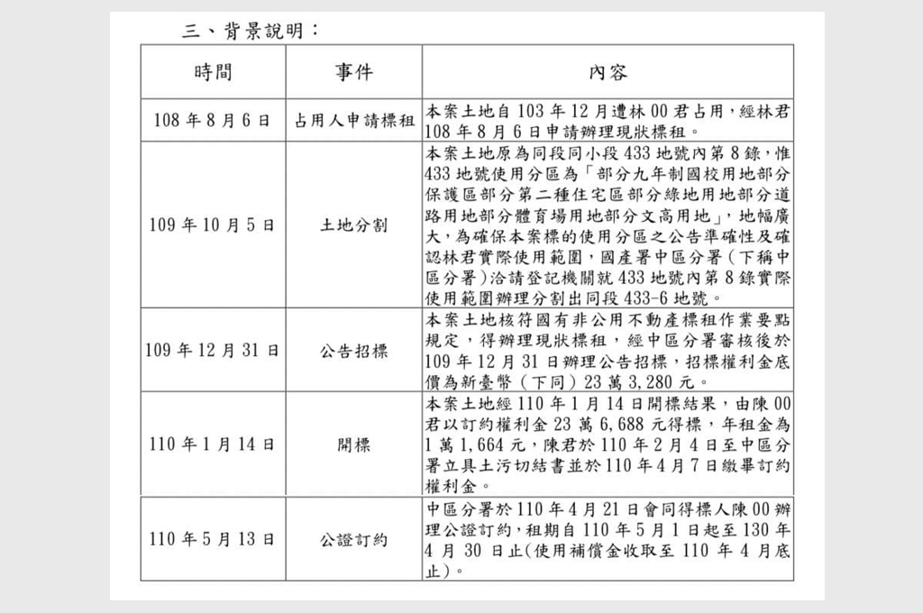 財政部國有財產署對此回覆,沙鹿大豪宅的國有地,自興建的2014年12月起由林○○占用,直至2019年8月才由占有人申請現狀標租,並在2020年招標。