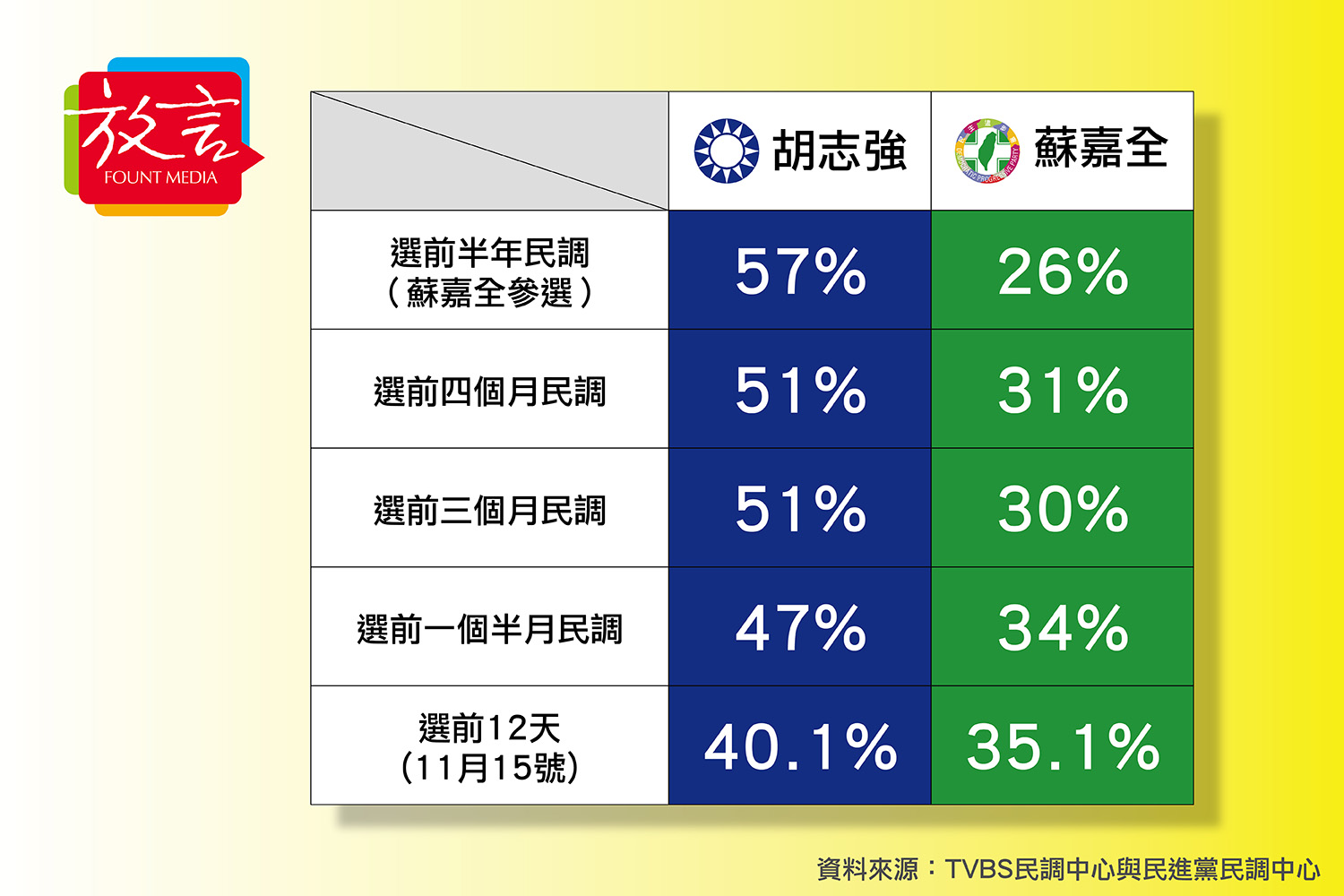 2018年選舉盤勢回到2010年?今年選舉與當年蘇嘉全對決胡志強有諸多類似,只是政黨角色互換。如果以2010年選舉做比較,林佳龍仍有機會連任。