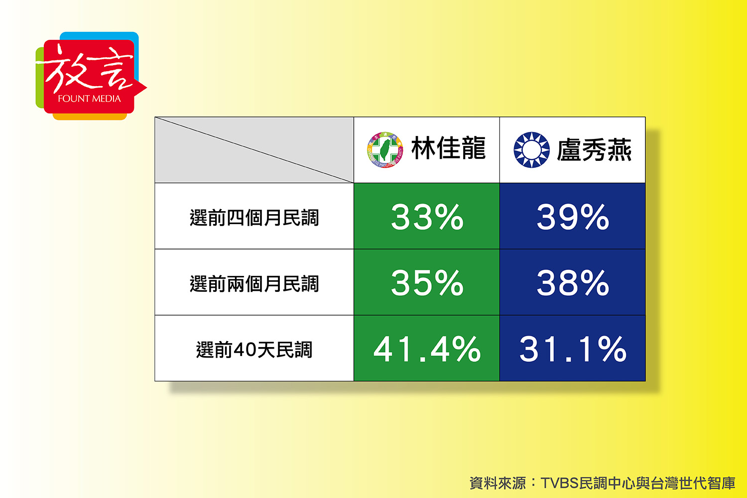 以這次龍燕對決比較2010年,林佳龍挾帶執政優勢,也有政績紅利,滿意度破5成,跟當年胡志強競選連任模式類似;與當年不同的是,當時胡志強民調大幅領先蘇嘉全,蘇嘉全在選前拉近;而林佳龍民調小幅度落後盧秀燕,但目前已逆轉,似乎也回到2010年的選舉盤勢。選戰即將進入倒數一個月,未來民調可能還有變化。