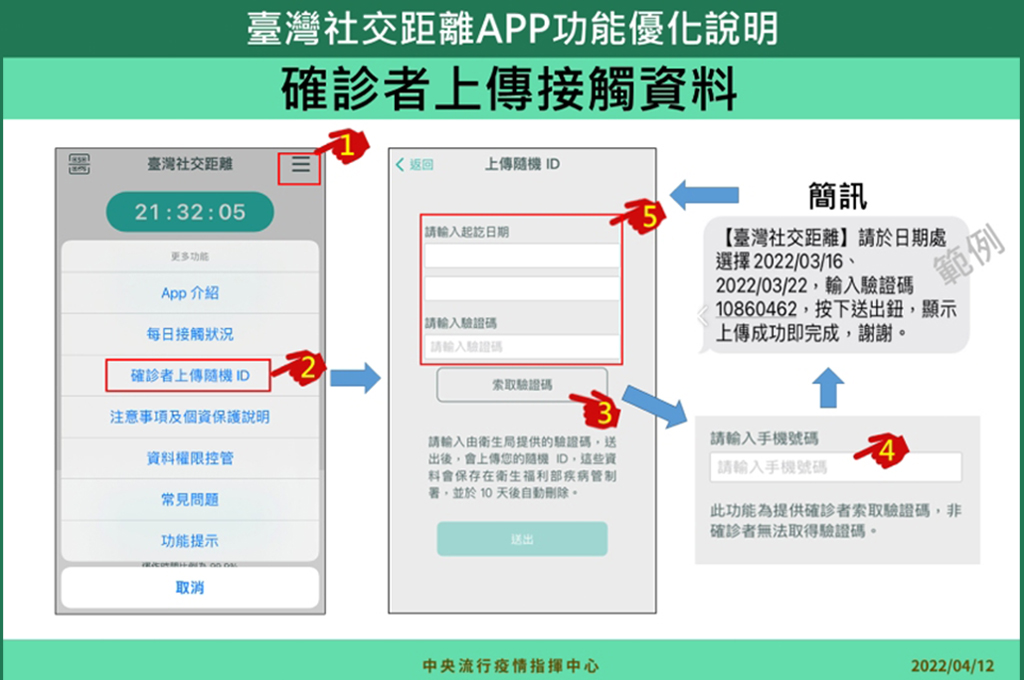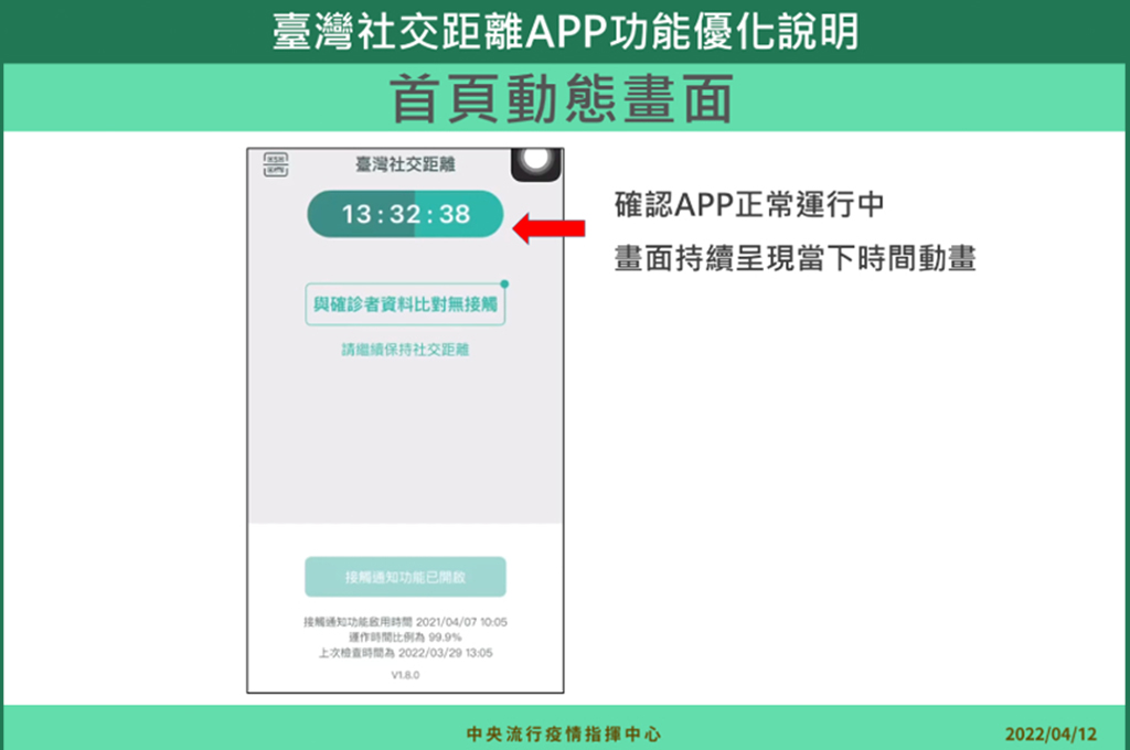 為了更全面性地使用,指揮中心優化此APP功能,包含「首頁動態畫面」及「確診者上傳接觸資料」等部分,「首頁動態畫面」為方便用戶確認APP是否正常運作;「確診者上傳接觸資料」則由衛生單位通知確診民眾操作APP以取得驗證碼後,由系統上傳其隨機ID及活動區間資料。