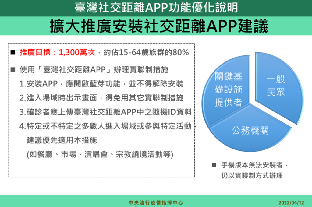 為提高「臺灣社交距離APP」使用率,將鼓勵公務機關及關鍵基礎設施提供者之工作人員安裝使用,並鼓勵一般民眾一起使用。另建議特定或不特定之多數人進入場域或特定活動時,如餐廳、市場、演唱會或遶境等場域或活動,優先使用此APP做為科技防疫工具,在後續之實聯通知上會更快速精準。