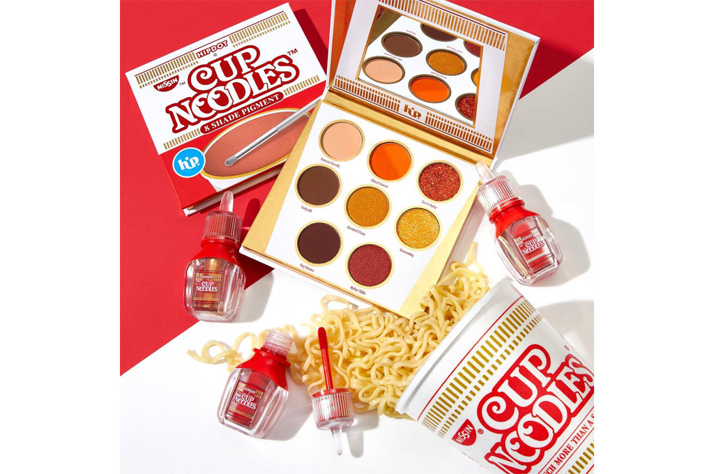2022年日清杯麵與美國彩妝品牌HipDot聯手推出將泡麵中的紅蘿蔔、烤玉米粒、拉麵、醬油、辣椒粉等等8款指標性食材配料,轉化成眼影、修容、唇頰彩的顏色,彩妝盤外型同樣讓人立刻聯想到日清杯麵。