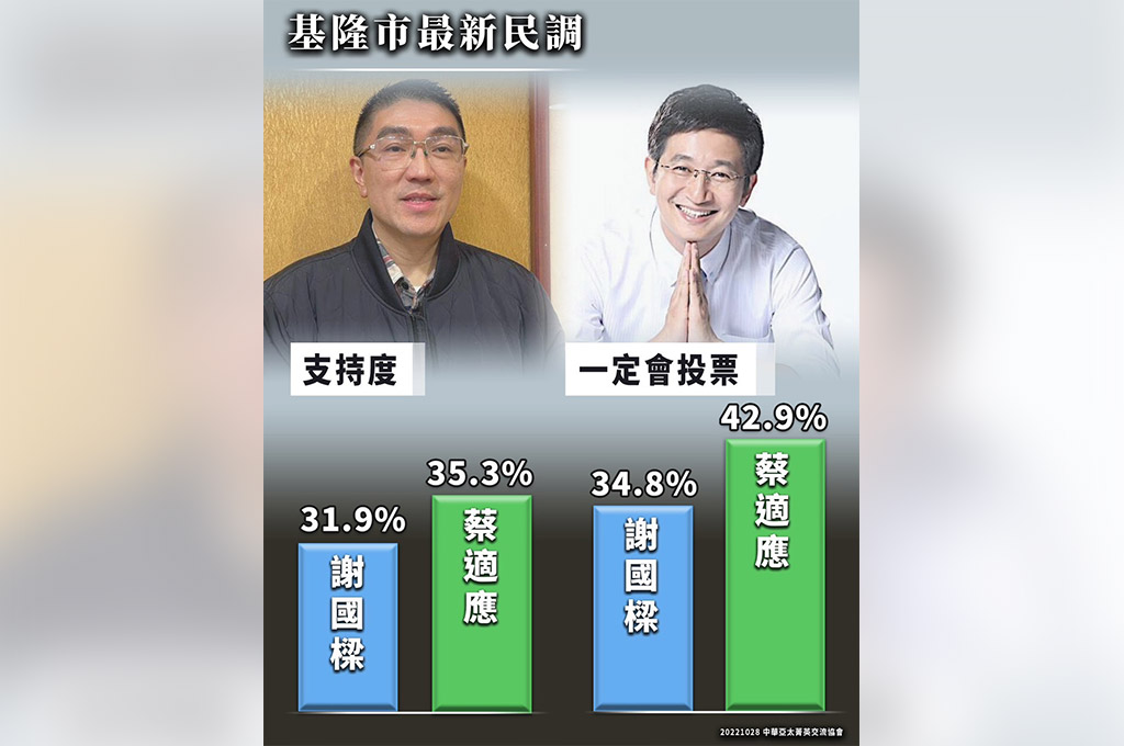 10月28日中華亞太菁英交流協會公布基隆市長選舉民調,蔡適應以35.3%的支持度領先對手謝國樑的31.9%。擁有8年在地服務經驗,加上現任市長林右昌及基隆市民的支持,蔡適應表示有信心贏得勝選!