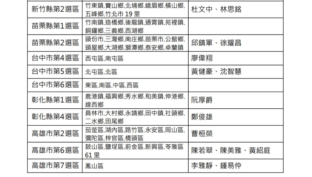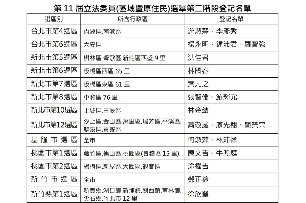 國民黨的第二階段登記已經截止,將會開始進行資格審查。其中各區參選人分別如下: