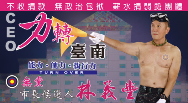 (圖1:林義豐裸上身的台南街頭看板。翻攝自林義豐Facebook臉書粉絲專頁「林義豐MarkLin」)