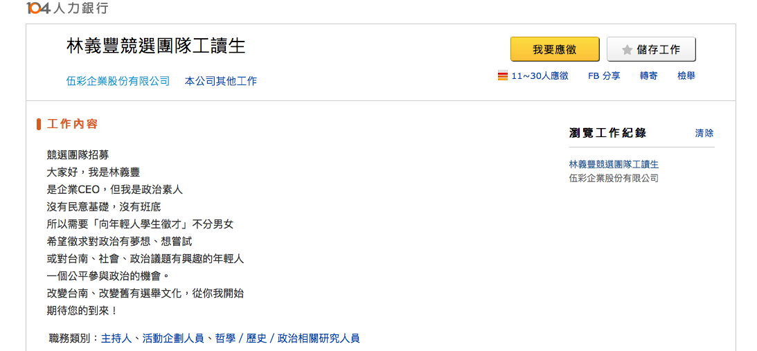 有了「老鮮肉」封號,林義豐以伍彩企業的名義,在人力銀行招募競選團隊,除了表明是企業CEO、政治素人,並強調「向年輕人學生徵才」「改變舊有選舉文化」,隨後火力更集中對年輕人的攻勢。