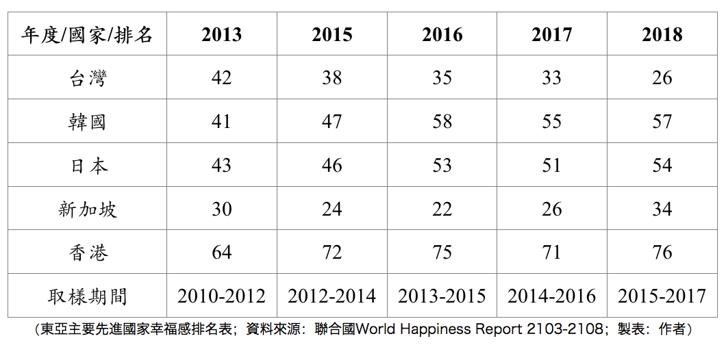 從聯合國幸福感報告有國家排名以來,我取台灣、韓國、日本、新加坡、香港的數字,如下表與圖。