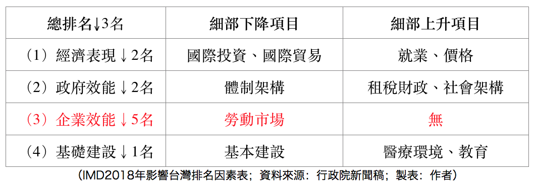 瑞士洛桑管理學院最近公布國際競爭力報告,台灣的競爭力整體排名下降三名,其中最大的原因是企業競爭力下降,而企業競爭力下降的最重要因素是勞動市場。