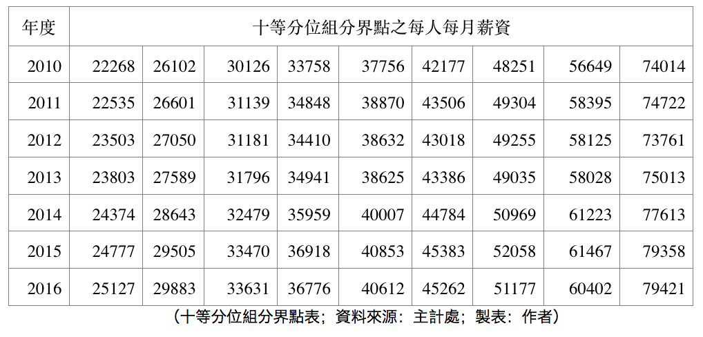 平均工時,每個月來看,長期趨勢很明顯就是下降,尤其是政黨輪替以後。那薪資變化呢?上一篇文章,我談過名目薪資跟實質薪資都在2018年創下歷史新高。這次我們就來看看薪資十分位數的變化趨勢。
