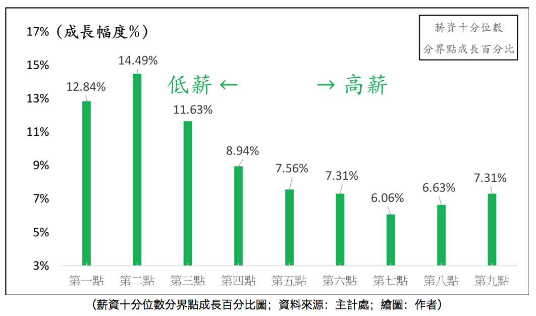 從表跟圖都可以看出來,越低薪的人,薪資成長幅度越大。這不是說台灣的貧富差距縮小,因為有錢人是靠錢在賺錢,不是靠薪水。這個圖是在說,