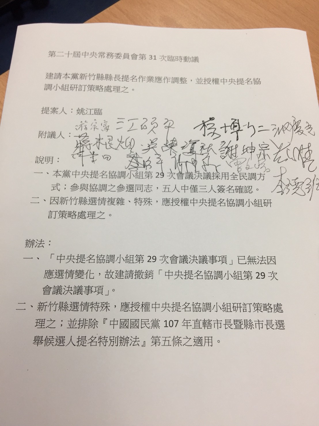 動議提案人姚江臨,一早電話通知多位中常委出席中常會,特別要求待到會議結束。有人這才知道要連署這項臨時動議,反問姚江臨:「會不會有問題?」姚江臨答:「難道我會害你嗎?」許多人意會,這項動議是黨高層的意思。
