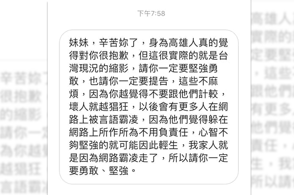 該網友給蔡女的私訊寫道:「妹妹,辛苦你了,身為高雄人真的覺得對你很抱歉,但這很實際的就是台灣現況的縮影,請你一定要堅強勇敢,也請你一定要提告,這些不麻煩,因為你越覺得不要跟他們計較,壞人就越猖狂,以後會有更多人在網路上被霸凌,他們覺得躲在網路上所做所為不用責任,心智不夠堅強就可能因此輕生,我家人就是因為網路霸凌走了,所以請你一定要勇敢、堅強,」