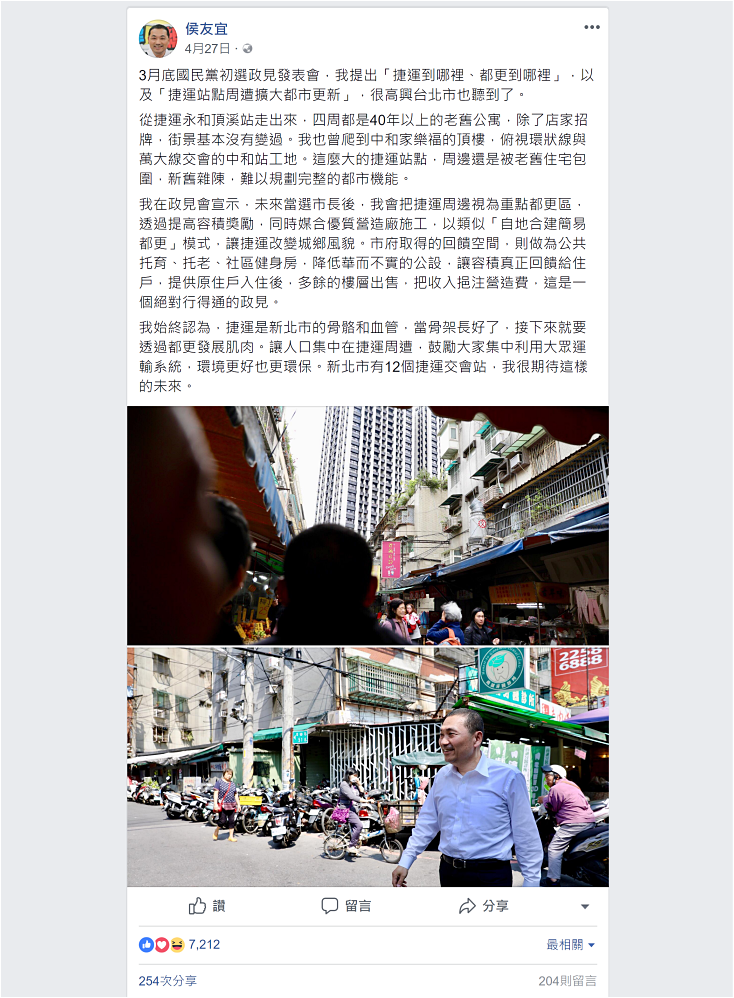 事實是侯友宜錯了。他說要用優先劃定更新範圍來改善捷運站周邊動線不良的問題。但早在「都更條例」第六條就有明訂類似問題可以劃入更新地區範圍的法律。倒是擔任七年半副市長的侯友宜,應該解釋為什麼過去不劃?現在朱立倫不劃?為什麼要等到他當市長才要劃?