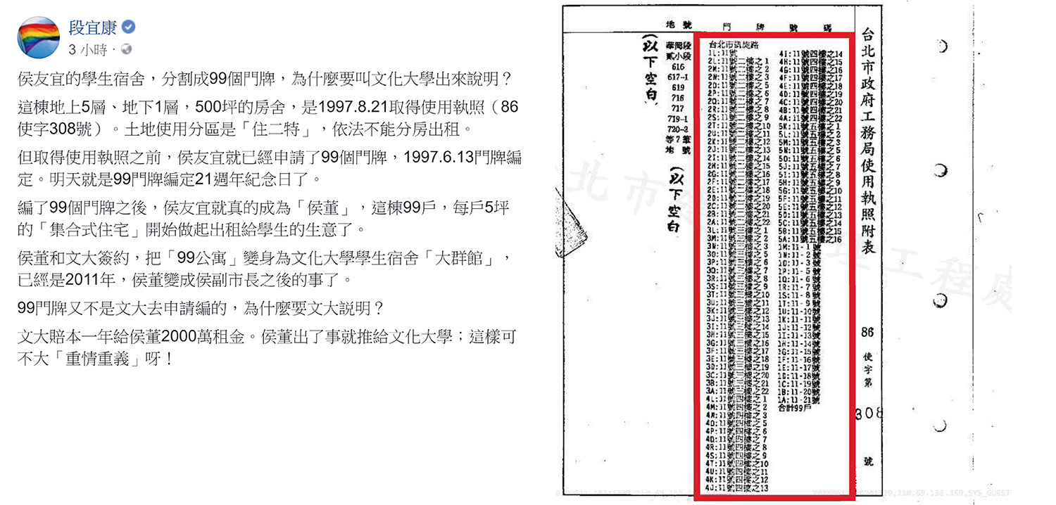 一萬八千元看起來已經比當地在外租屋好多了,是嗎?然而這些文化大學的學生可能不知道,這一棟被文化大學稱為「大群館」的學生宿舍,其實房子的主人侯友宜夫婦,早在民國86年時,就幫這棟房子申請了九十九個門牌,奇怪,一棟房子要九十九個門牌幹什麼?這就是重點了,各縣市的明星學區或是大學附近,許多屋主為了賺取租金,或是供人將戶籍遷入,一戶變成好幾戶,早就是大家不說出口的秘密,最有名的例子,就是師大附中附近,為了可以取得就讀師大附中國中部的資格,一棟房子分成好幾戶給人寄戶口,而分成好幾戶之後,除了獨立門牌本來行情就好,分割出租或是買賣也非常好管理,然而這樣的「偷吃步」漏洞,內政部在民國88年用一紙函釋將它堵上了,自此之後,一戶變多戶的行為,必須要先經過建築師認可,沒有牽涉到更改建物結構及原始設計規範,才能進行,由此可見,侯友宜夫婦的眼光真的是相當「精準」,在函釋出來的一年多前就把這些分戶的動作搞定,果然不是普通人。
