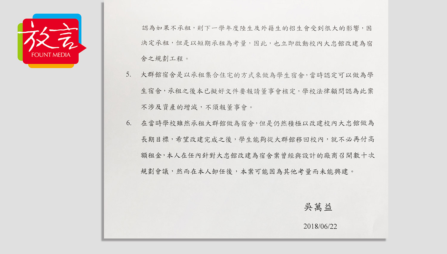 侯友宜文大宿舍案當年簽約人文化大學前校長吳萬益,今(21)日公開說明向侯友宜太太又昱公司租用大樓做學生宿舍原委,他在文字稿及影音聲明中,都明確指出,堅持每年調漲租金百分之五的,是又昱的任董,也就是侯友宜太太任美鈴。