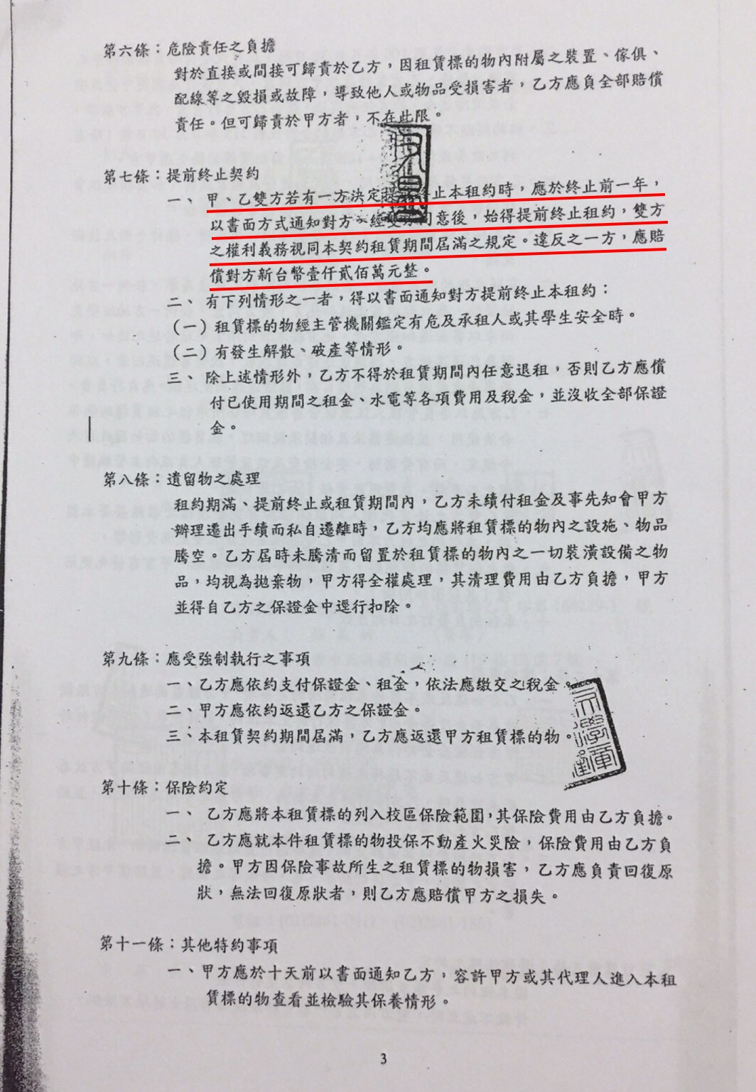 謝震武解釋,「提前終止」一定是表明不合適,提前一年通知解約,就能解約。另外還有一種寫法是提前一年通知,通知一年以後合約就自動終止,等於多付一年費用。回頭檢視文大與又昱簽訂的合約則是:「甲乙雙方如果有一方決定要提前終止這個租約的話,在終止前一年,以書面上通知對方,經雙方同意後可以提前終止。」表示「這根本就是廢話」、「所有事情只要寫上雙方同意,那就是個具文,具文就是廢話。」