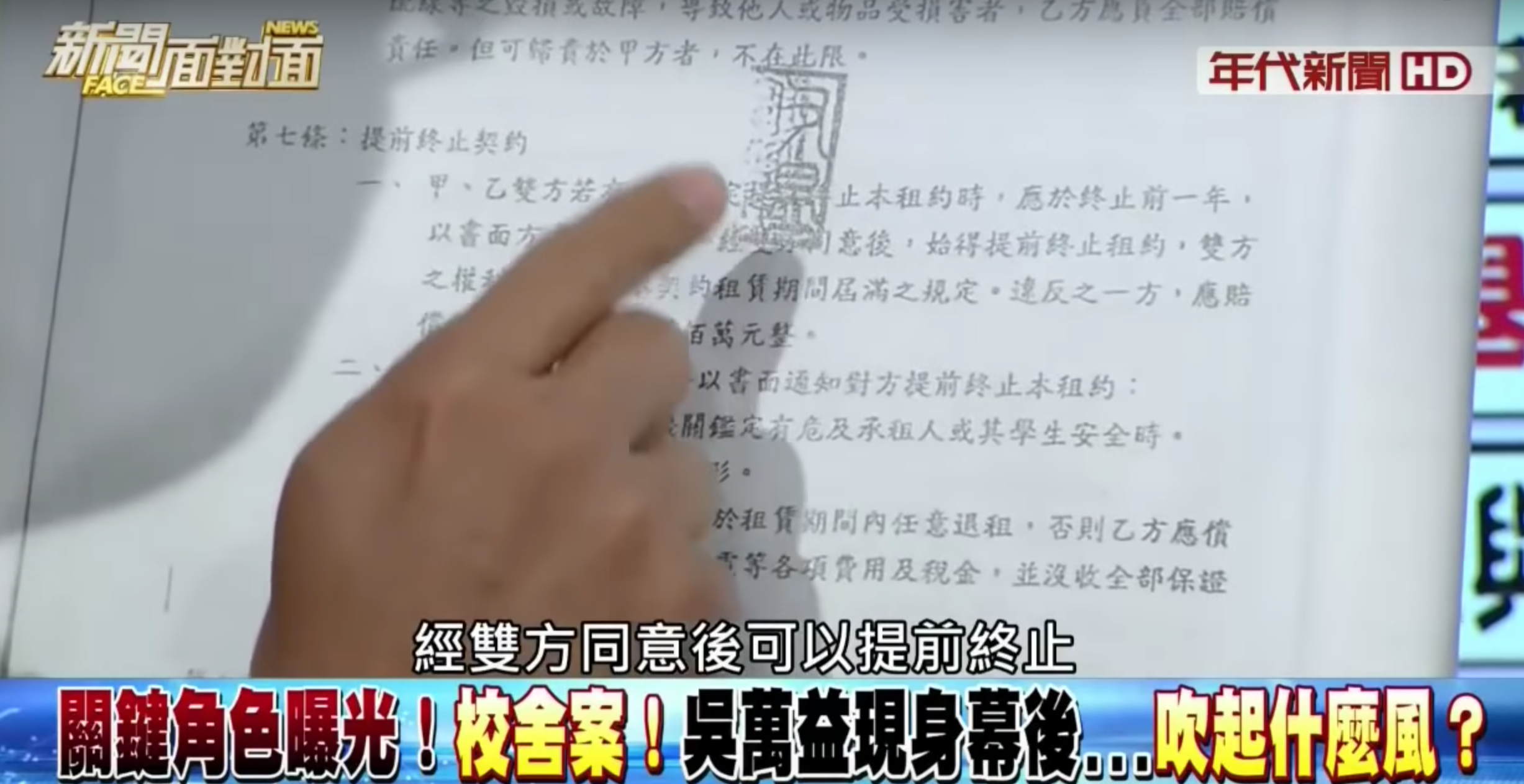21日晚間在《新聞面對面》政論節目中,主持人謝震武律師,拿出任美鈴擔任又昱實業公司董事長時與文化大學簽訂的書面合約,在合約第三頁提及「應於終止前一年,以書面方式通知對方,經雙方同意後,使得提前終止租約」,質疑到底文化大學通知提前解約,有什麼實質意義?