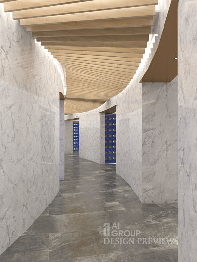 為打造身後新世界「桃花源」,龍巖此次與築內國際合作,藉其專業設計柔化冰冷空間,尤其在空間整體氣氛以《桃花源記》作為發想;入口玄關以LED螢幕展現桃花源意象水墨畫,搭配天氣而呈現不同氣象景色,讓人彷彿踏進「林盡水源,便得一山」的世界。接著在迴廊採用弧形廊道的設計,營造「初極狹,纔通人」轉折效果。天花飾以波浪狀的格柵,呈現桃花林蔭之感。白色大理石的壁面設計則是為了營造與入口處的反差,也讓整體空間顯得純淨而簡潔。