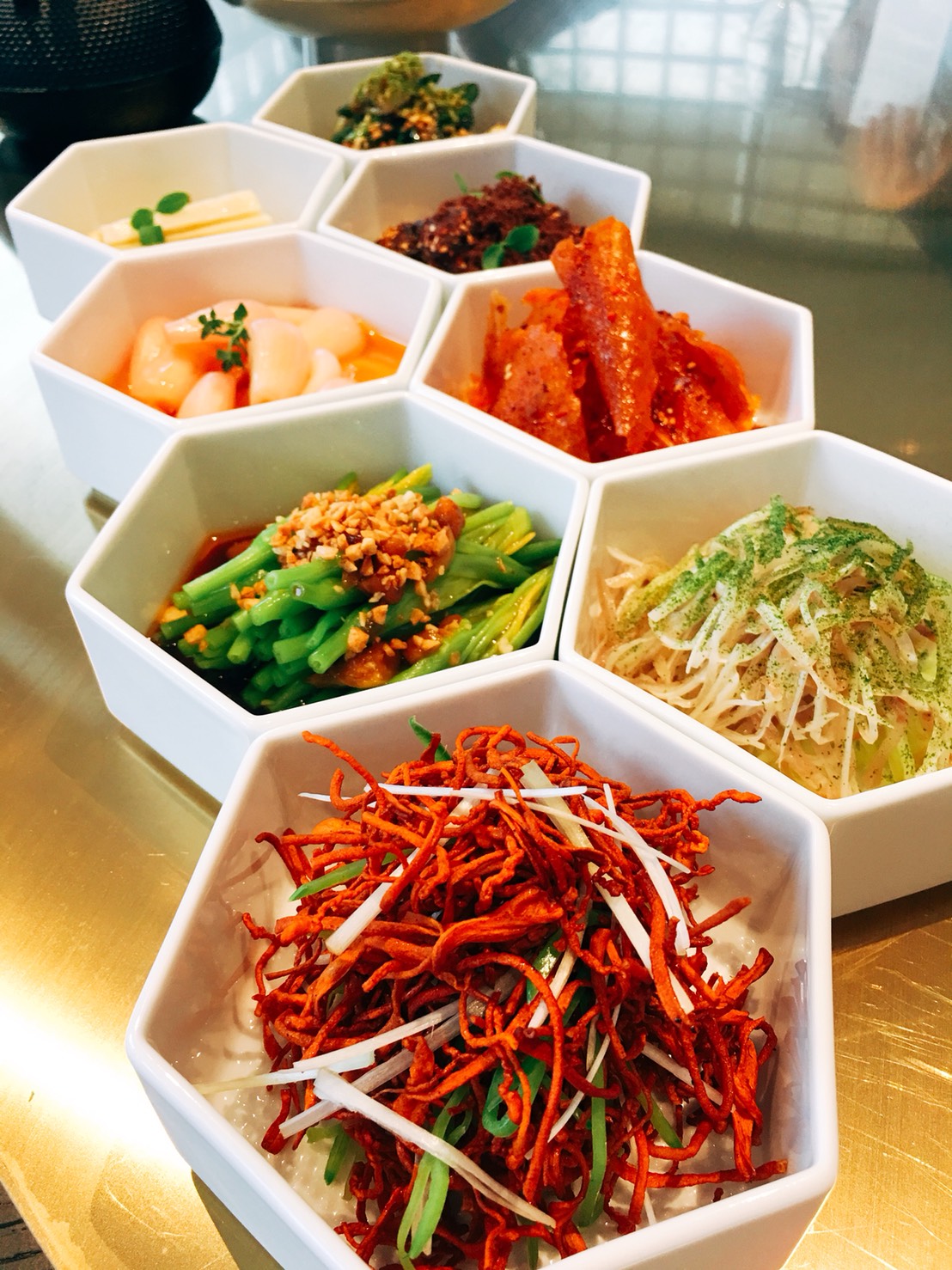 燈影魚片,枇杷漬蕎頭,鮮椒冰花牛舌捲,臘八豆拌鮮黃花,松果麻醬鳳尾菜皆有新意,但傳統的椒麻,怪味,蒜泥,也都輪廓清楚,線索可辨。豆豉鯪魚油麥菜,傳統農家菜卻在主廚的巧思下華麗轉身;椒香藜麥筍殼魚和蟹黃紅油辣拌麵,完全是騙過眼睛的川味菜,若說是21 世紀的新川菜,我認。
