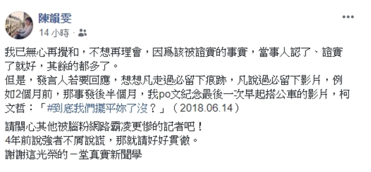 陳韻雯文末諷刺地謝謝「這光榮的一堂真實新聞學」,也呼籲柯文哲要好好貫徹四年前說的「強者不屑說謊」,請大家一起關心其他被腦粉網路霸凌更慘的記者。