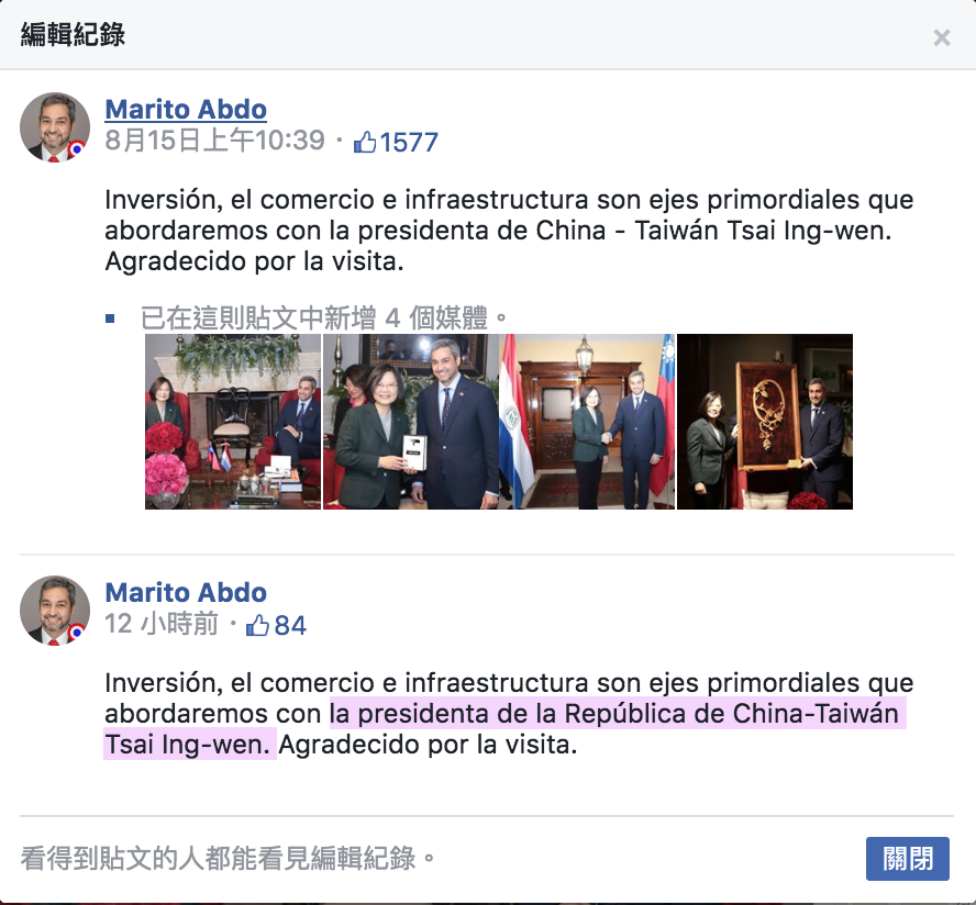 台美關係升溫,蔡英文總統參加巴拉圭總統阿布鐸就職典禮。原先,阿布鐸在臉書和推特發文感謝蔡英文親臨,卻稱蔡英文是「中國台灣總統」,引起外界議論。據了解,巴國外交人員注意到國內報導,怕引起誤會模糊焦點,所以將阿布鐸臉書貼文修改成「中華民國台灣」,並將該篇推特刪除。