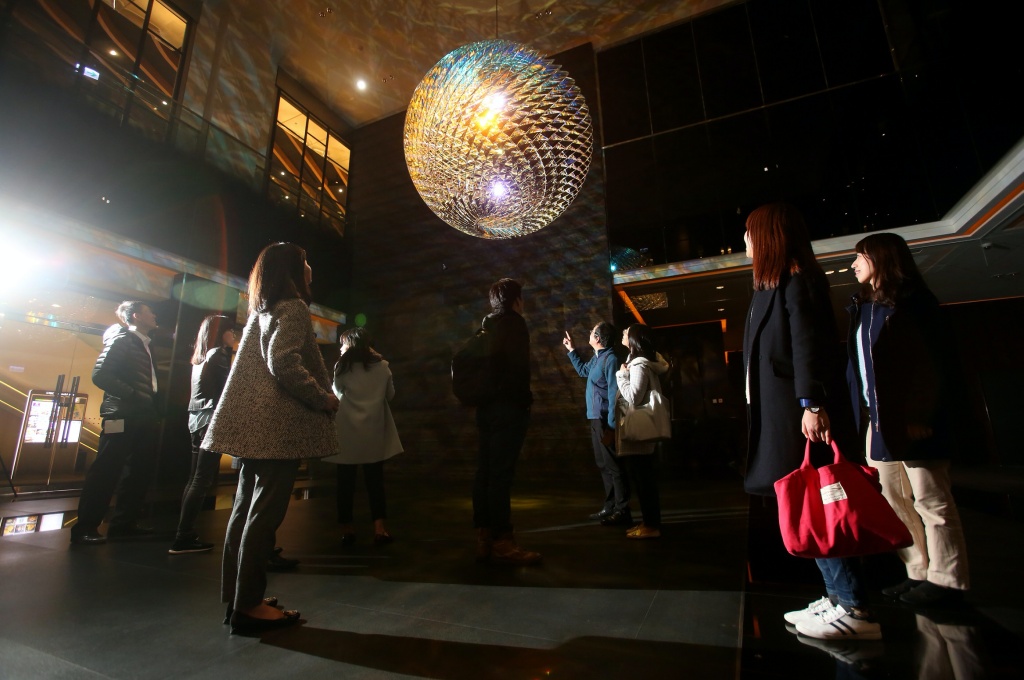 (北歐藝術家奧利佛‧埃利亞松的經典作品《Enlightenment Sphere》以2,175片手工玻璃鑲嵌成直徑達275公分的球體,裝置於中國信託園區B棟大廳,強調光影和空間變化。/中信銀行提供)