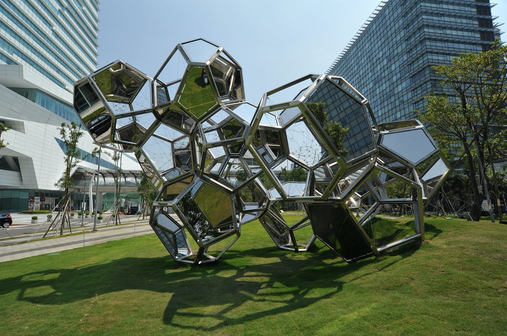 (阿根廷藝術家Tomás Saraceno的作品《雲城市:HAT-P-12》坐落於中國信託金融園區旁的三重世貿公園,藝術家以多邊形不銹鋼鏡面打造出「雲」的意象。/中信銀行提供)